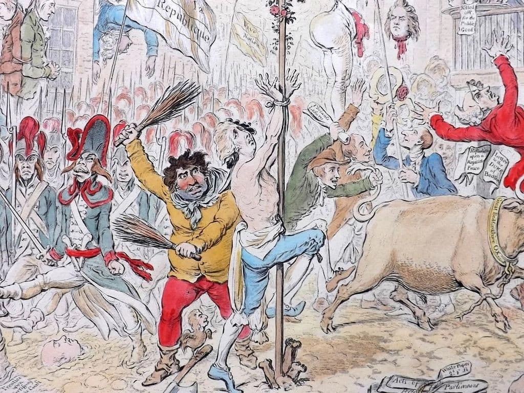 The work is a commentary on social mores and the authorities’ attempts to combat gambling and other ‘vices’ in late 18th century England. - This print from 1796 is a satire on the opposition and the possible consequences of a French invasion of England.It depicts a chaotic scene with elements of the French Revolution, such as a freedom tree and the execution of figures.