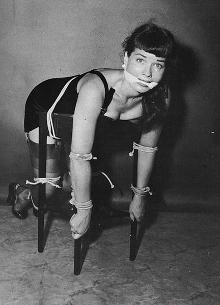 From 1952 through 1957, she posed for photographer Irving Klaw for mail-order photographs with pin-up and BDSM themes, making her the first famous bondage model. Klaw also used Page in dozens of short, black-and-white 8mm and 16mm “specialty” films, which catered to specific requests from his clientele. These silent ‘one-reel’ featurettes showed women clad in lingerie and high heels, acting out fetishistic scenarios of abduction, domination, and slave-training; bondage, spanking, and elaborate leather costumes and restraints were included periodically. Page alternated between playing a stern dominatrix, and a helpless victim bound hand and foot.
