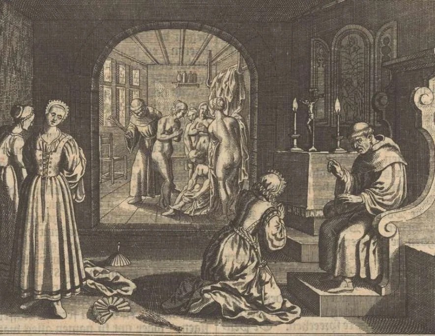 His chosen ones needed to confess to him (and him only!) where he showed a particular interest for their sexual fantasies. He would ask some woman to undress after which they would need to humbly request to be disciplined with a birch they would have brought with them themselves. Adriaensen would then whip them in a sensual way ‘Slowly with a certain number of hits that would not hurt’. Ofcourse the woman were forbidden to speak about this secret order to others since (as Adriaensen told them) they would not understand the benefits of it. He was betrayed by Calleken P and Betteken Maes, Betteken asked him for a proof in the Bible of his theory that woman who stayed virgin, or the married ones who did not enjoy sex, would for sure go to heaven, should they not be this devoted they would get little chance of going t heaven. It all went down when Betteken Maes found a better priest in the blind Monk Michiel, it seemed Adriaensen got jalous, he threathens Betteken with inquisition and spreads rumors of her having Erasmianian thoughts and he tries to convince te wealthy powerful habitants of Brugge of the bad person Betteken is. Unfortunetely for Adriaensen they as well had Erasmanian thoughts. Betteken had no other choice then to tell her rich friends about the secret order and investigation of Adriaensen was what followed. Alongside some fantastic rumors and artworks about the penance Adriaensen brought upon his devoted followers. I tried to collect those artworks, most of them the artist remains unknown and otherwise is mentioned in the image.