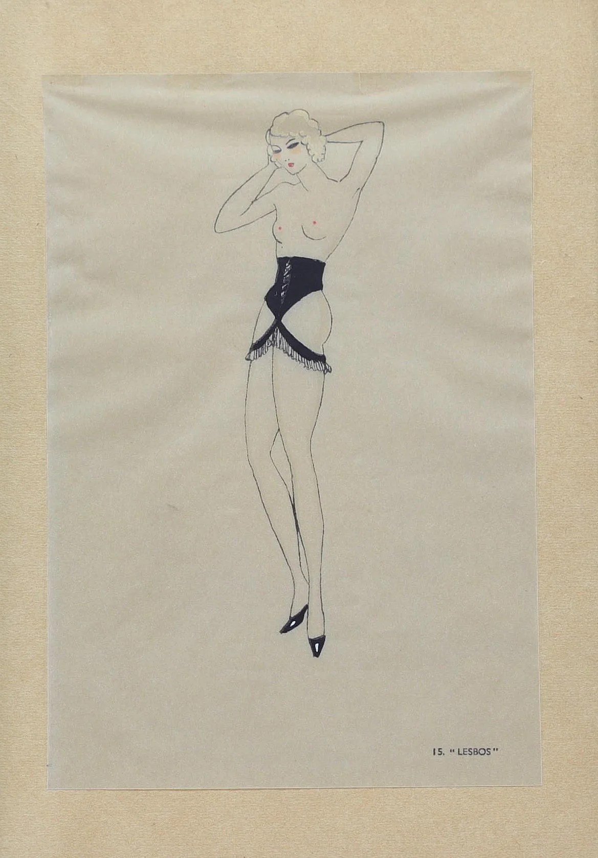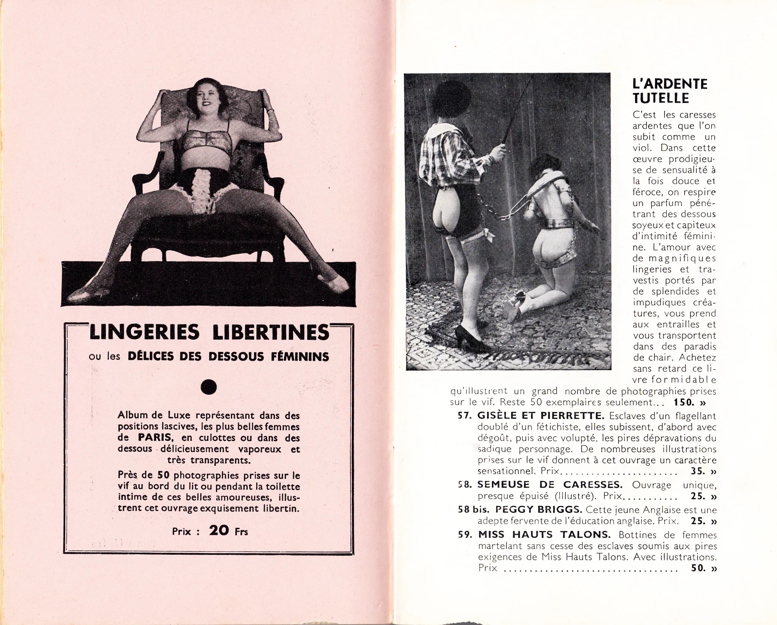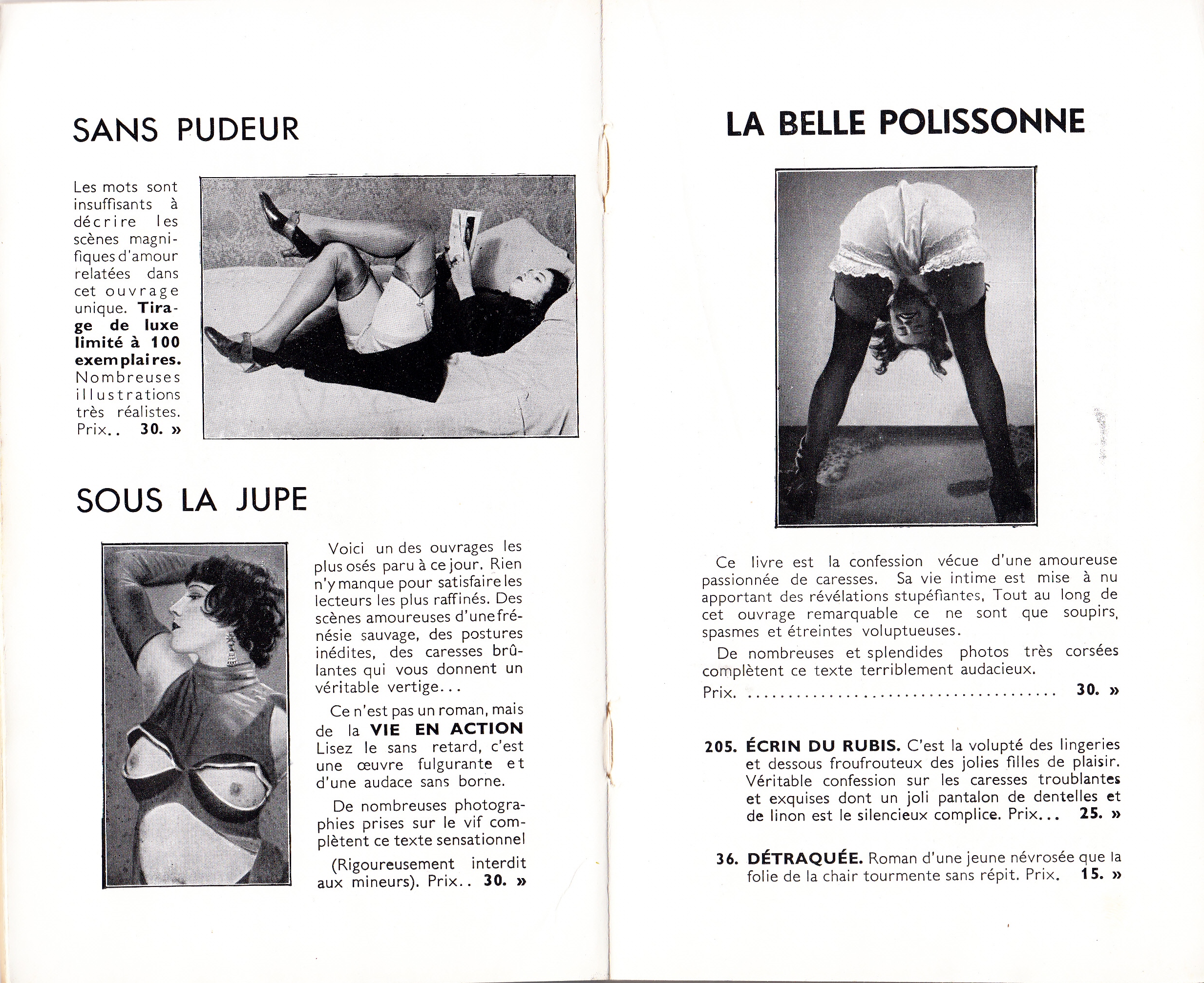 This enterprise extended beyond conventional lingerie production to encompass a diverse range of products and services, including fetish wear, erotic books, and condoms. It also operated the Librarie de la Lune, likely a venue for pornographic literature, and produced illustrated catalogs and magazines such as Lingerie Libertines and the Parisian Magazine, reflecting its deep engagement with erotic culture. Photographers such as Jacques Biederer, Jean Moral, Roger Schall, Brassaï, André Kertesz and Manassé Studio contributed extensively to its photographic output, capturing the essence of its offerings. Alongside these efforts, unknown artists provided sketches that enriched its visual legacy.