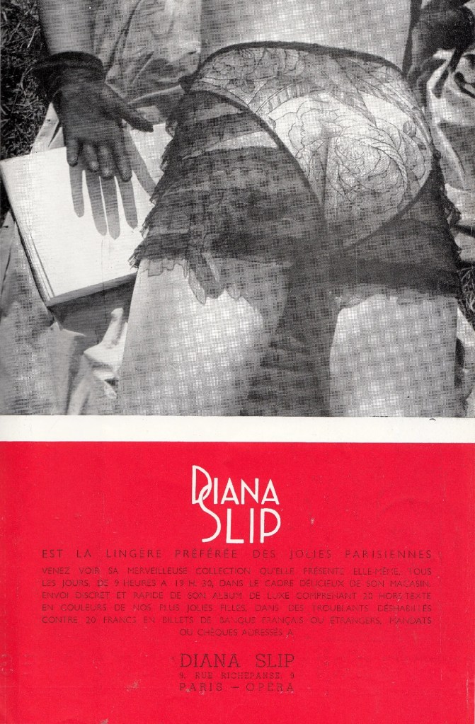 An album containing 29 beautiful plates of drawings of libertine lingerie, published by the Diana Slip brand in the 1930s. At first I found this publication, when digging some more I found a large collection made available by Paris Olympia Press. According to the webmaster that publication (Libertine Lingerie) was published in 1939. Be sure to view more via Paris Olympia Press.