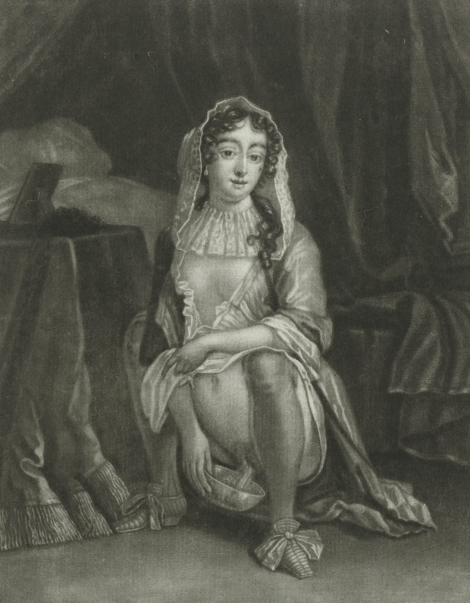 This mezzotint (by John Smith) depicts a monk in a habit raising a whip above a kneeling woman, her buttocks exposed as she clasps her hands in a prayer-like pose. An open book on a shelf in the background suggests a monastic setting. Historically, this reflects flagellation as a religious penance practice, but Smith’s rendition carries an erotic undertone. The woman is identified as Mrs. Russell, a noted courtesan, aligning the print with 17th-century erotic satire.