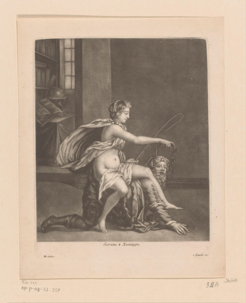 This satirical mezzotint portrays Xantippe, Socrates’ wife, riding naked (save for a loose cloth) on his back, wielding a whip and reins as he crawls on all fours. A scholar reading in the background adds a philosophical context. Historically, it mocks Socrates’ marriage, drawing on anecdotes of his domineering wife.