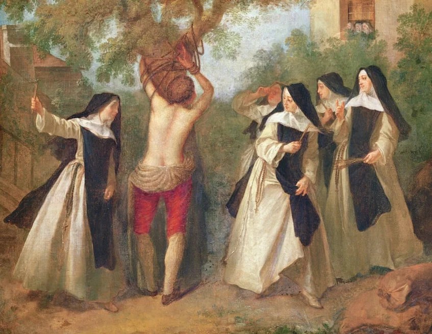 Austrian genre painter Adam Johann Braun captured the scene in 1789: a nun birches a schoolgirl’s bare cheeks for reading “inappropriate” letters. Is it strict discipline, or does a sultry subtext linger? Similar moods surface in anonymous 18th‑century French prints that show friars flogging nuns with fluffy‑tailed whips—perhaps meant as ritual humiliation, perhaps as pure titillation.