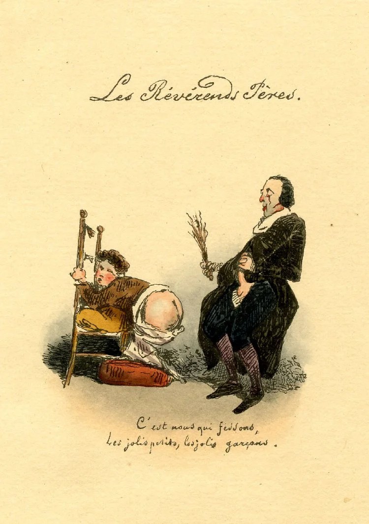 The Enlightenment saw a boom in French “convent pornography”: cheap pamphlets filled with anti‑clerical cartoons of licentious friars and birch‑wielding sisters, sold side‑by‑side with brothel advertisements in Paris’s Palais Royal. In the 19th century, the Belgian artist Félicien Rops and writer Léon Louÿs produced explicit etchings of nun‑whippings, blending satire with sadomasochism.
