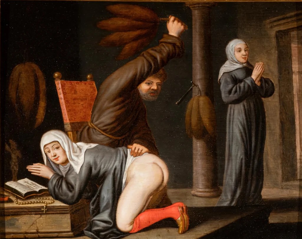 Art has both preserved and eroticized these moments, turning acts of penance into a kind of light‑handed pornography. From the 15th through the 18th centuries, European painters and engravers seemed unable to resist the sight of a habit‑clad rear.