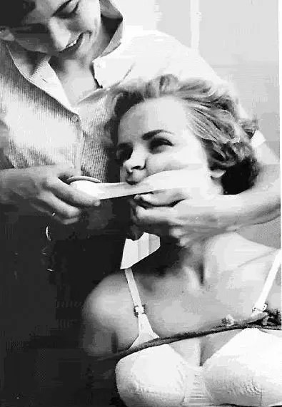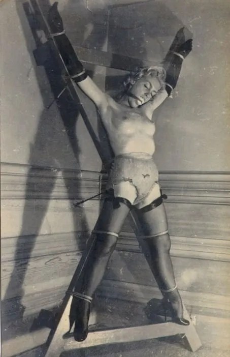 Judy’s path crossed with John Willie in 1957, when he arrived in LA to expand his bondage artistry. She quickly became one of his favorite models, starring in a series of evocative sessions that captured her effortless poise amid intricate ropework and playful peril. Whether suspended in outdoor sunlight, elegantly bound against wooden panels in high heels and lingerie, or sharing the frame with fellow models in narrative sets, Judy’s presence added a layer of genuine emotion, a subtle smile, a defiant glance that elevated Willie’s technical precision into something profoundly human.