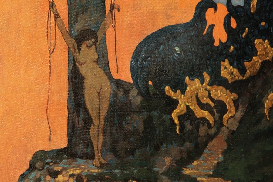 Marian Wawrzeniecki (c. 1863–1943), the enigmatic Polish painter, archaeologist, and art historian, bridged the scholarly pursuit of ancient relics with the visceral pulse of fin-de-siècle erotica. Emerging from Warsaw’s crumbling empires in the late 19th century, Wawrzeniecki’s dual life as a guardian of pagan artifacts by day fueled his nocturnal visions of primal rites and forbidden surrender. Drawing from Slavic mythology, summoning deities like Swarożyc and Lelum-Polelum amid thorn-wreathed groves and swastika-carved stones, he transformed historical reverie into portals of shadowed desire, where consensual captivity and mystical union blurred the line between pleasure and peril.