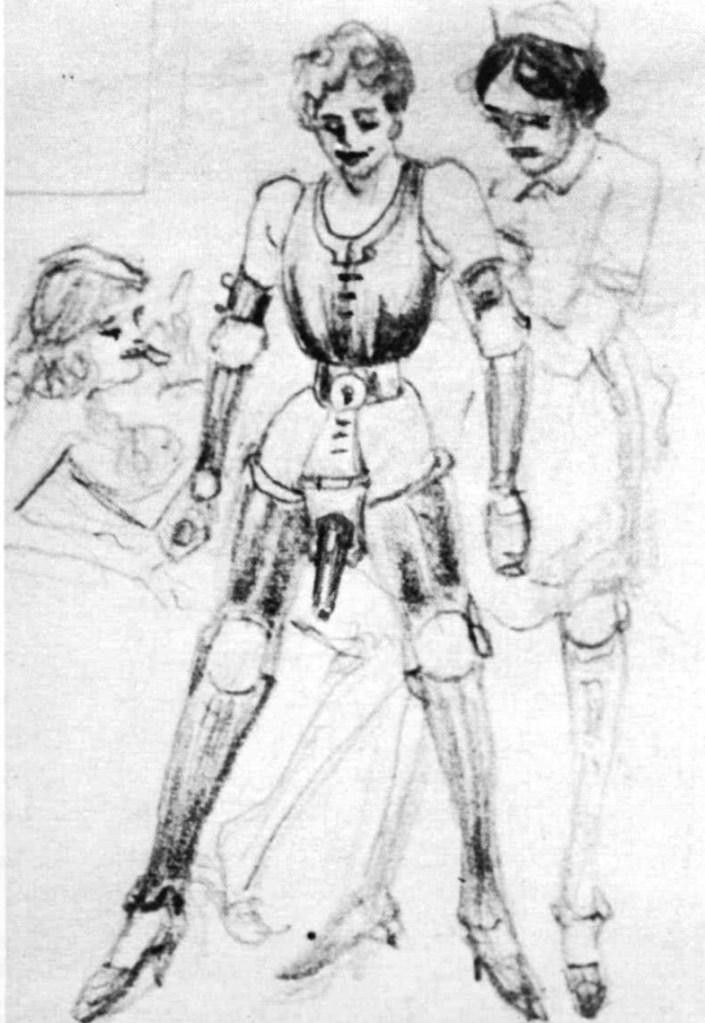 Personal tragedy struck with his wife’s death before the war, prompting a relocation to Berlin in the 1920s with his stepdaughter. There, as a successful commercial designer amid cabaret decadence, Prött channeled his private obsessions into art: he practiced extreme self-discipline through leather corsets, steel bandages, chastity devices, and dilation tools, often creating while “fixated at his drawing board.”