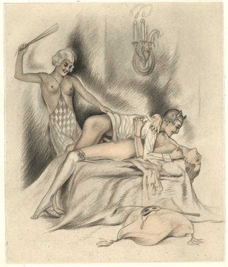 Réunier’s most enduring contribution is his 1925 portfolio Autour de l’Amour (All About Love), a limited-edition suite of 27 original signed etchings released in Paris (though produced in Stuttgart). Presented in a luxurious green-cloth portfolio with red morocco accents, the first 50 copies featured hand-signed plates. The drawings unfold as a lustful circus of the senses: harlequins in erotic tableau, irascible governesses wielding corrective fervor (La Gouvernante Irascible), and figures entwined in a ballet of dominance that blends whimsy with raw intensity. Motifs of spanking, restraint, and ecstatic torment recur, rendered with a draftsman’s precision that elevates them to high art.