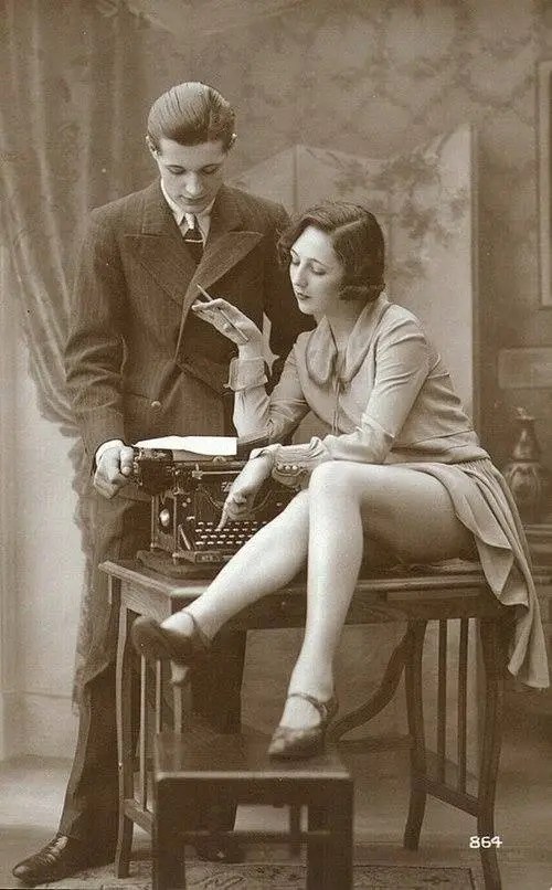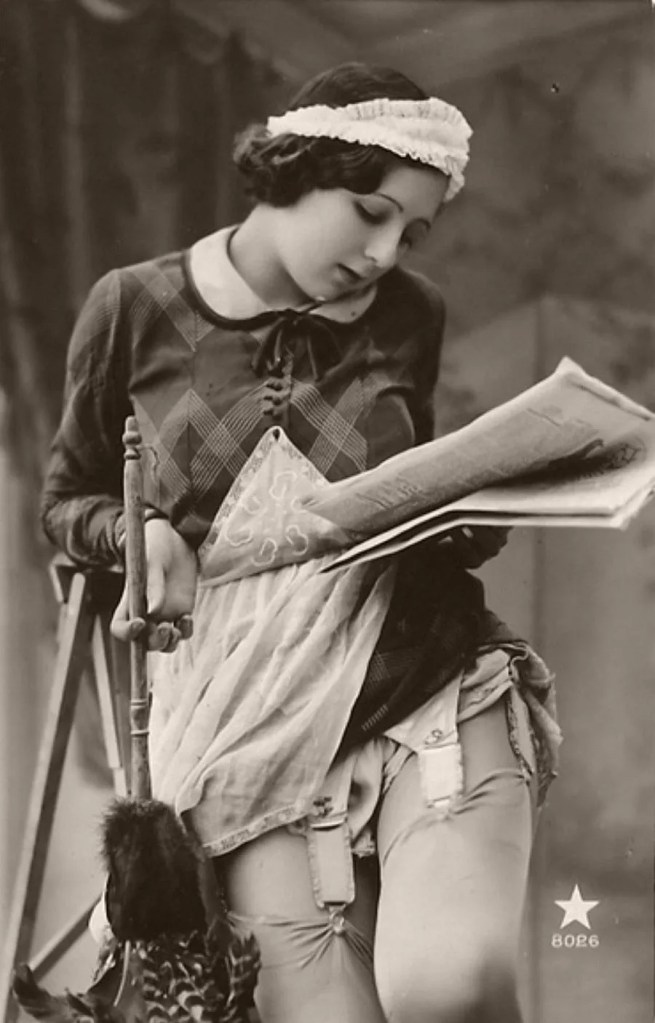 But it is in the Biederer brothers’ lair that Desmoulins truly unbound. Unlike the legion of nameless models who arched under their gaze, she alone signed her skin to their legacy: risqué, nude, and laced with the subtle BDSM undercurrents that defined their oeuvre. From 1920s sessions, her images capture role-play’s delicious alchemy. A secretary bent over a desk in His Secretary, a maid in frilled apron teasing submission in Maid Service, or doll-like ingénue cradling porcelain in Doll Life, her eyes half-lidded in feigned innocence. Mirrors multiply her form in Lucette and the Mirror, reflections folding into infinite vulnerability; a “Dangerous Dame” gloved and gartered, hinting at the power yielded in a single glance.