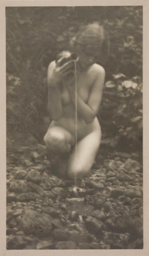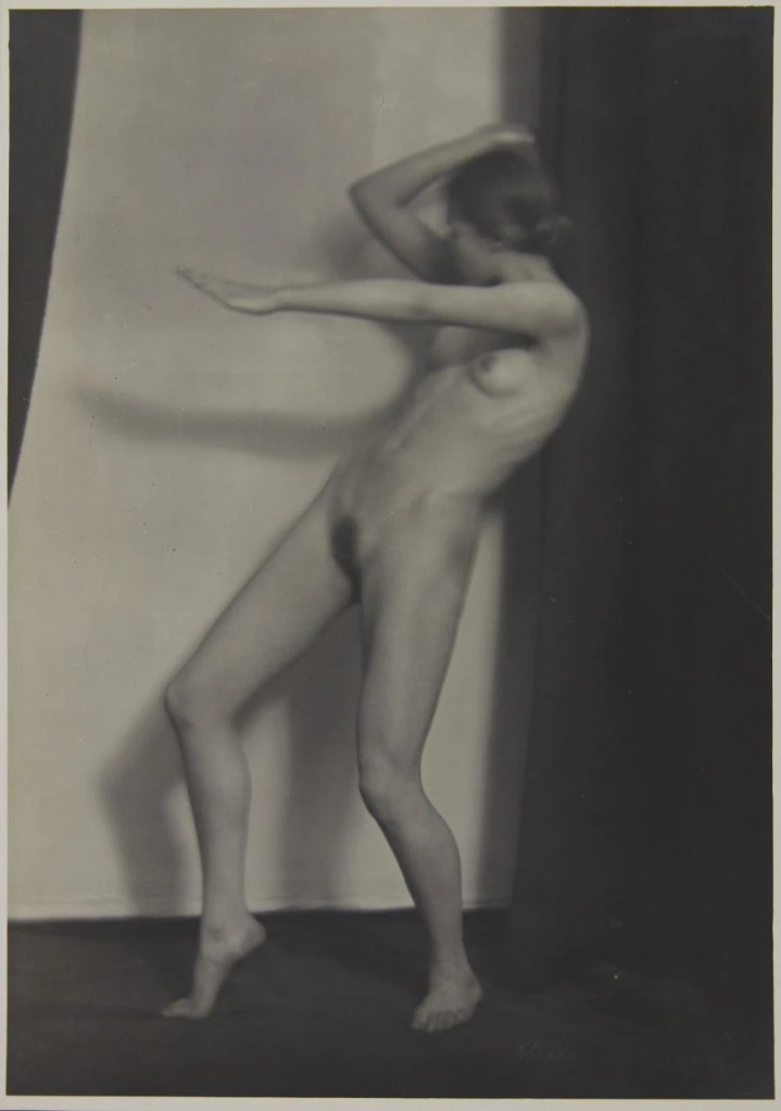 Other figures bridging 1880–1950 include Germaine Krull (1897–1985), whose erotic nudes carried emotional and formal innovation, Imogen Cunningham (1883–1976) explored sensual forms through nudes and botanicals, often turning the lens on her own body or close intimacies that evoked touch and vulnerability and occasional self-explorations by artists like Margrethe Mather (1886–1952), who infused sensuality with modernist design. Anne Brigman (1869–1950) became one of the first American women to photograph herself nude, framing her body against natural landscapes in spiritual, ethereal ways, infusing sensuality with a sense of freedom and connection to nature rather than mere eroticism.