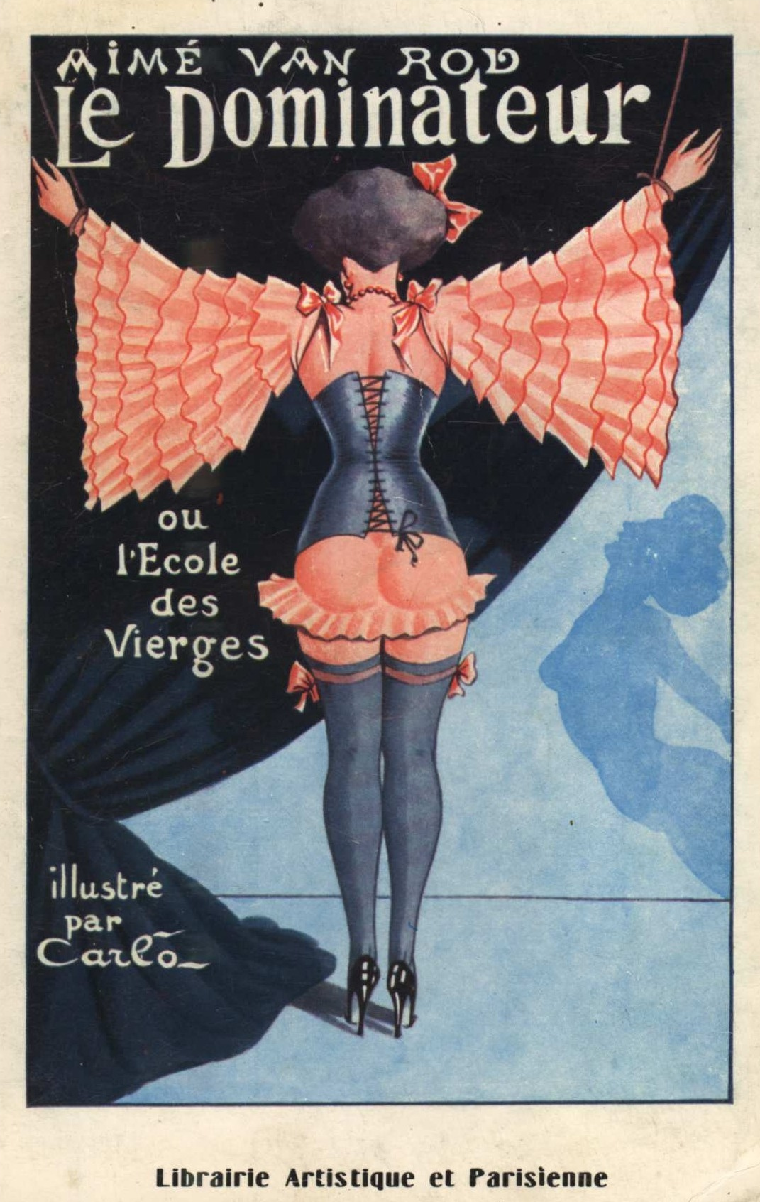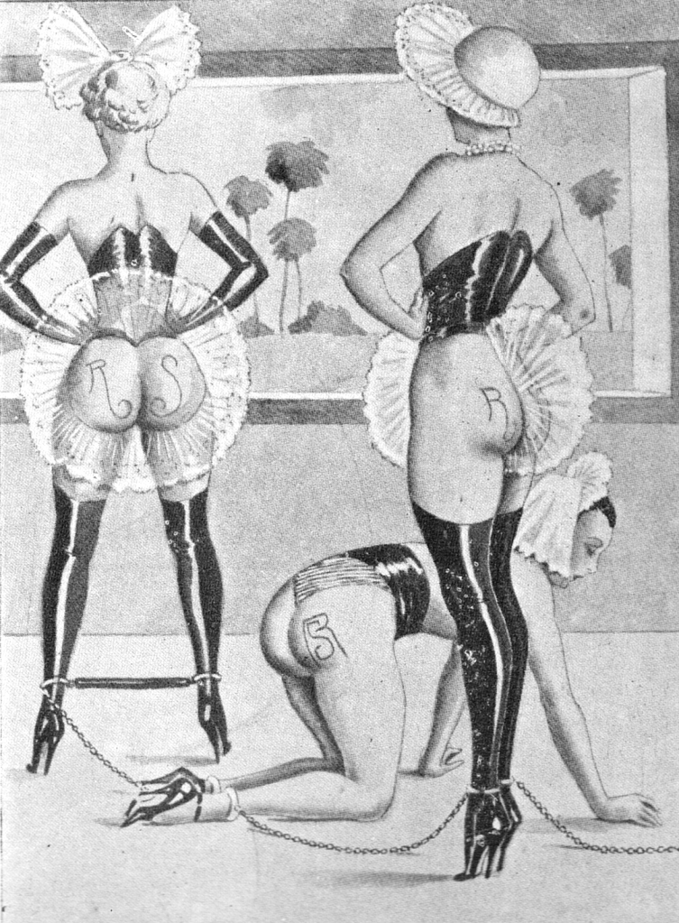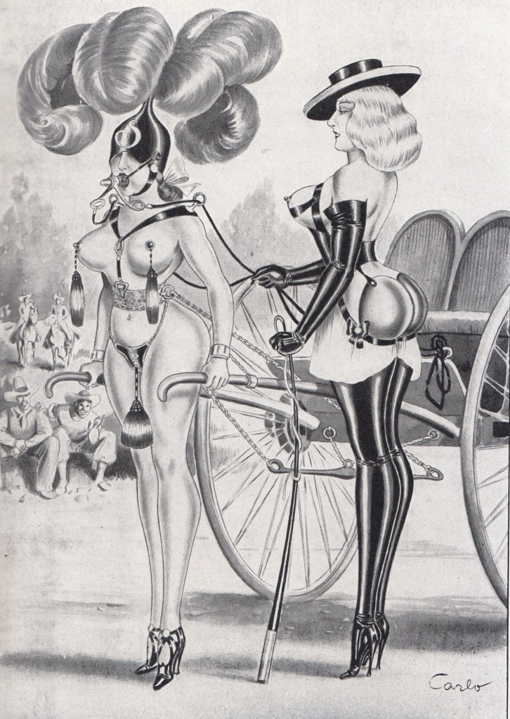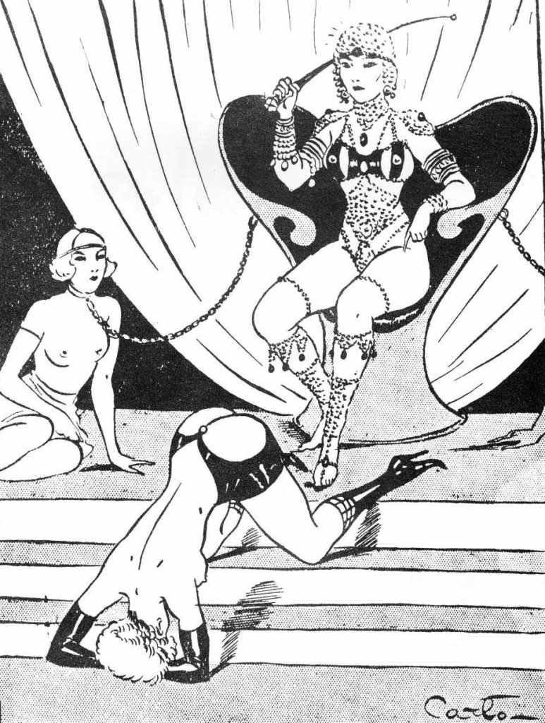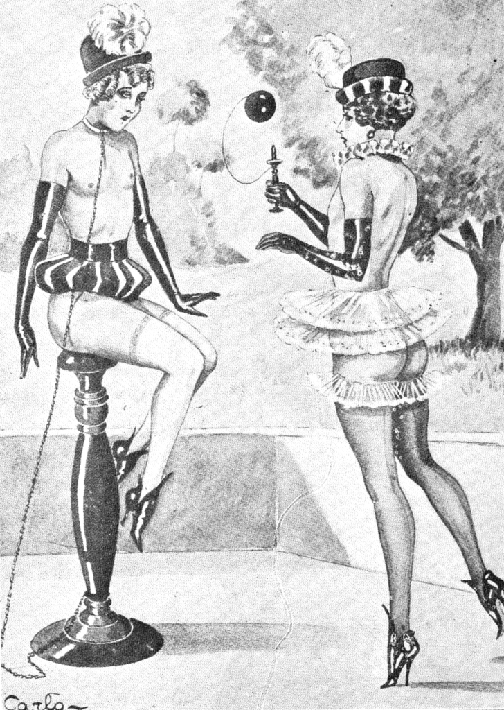 Carlo helped shape the visual language of fetish art during the golden age of French flagellation literature. His innovations in leather, high heels, and coercive attire clearly influenced later artists such as John Willie and the postwar fetish scene.