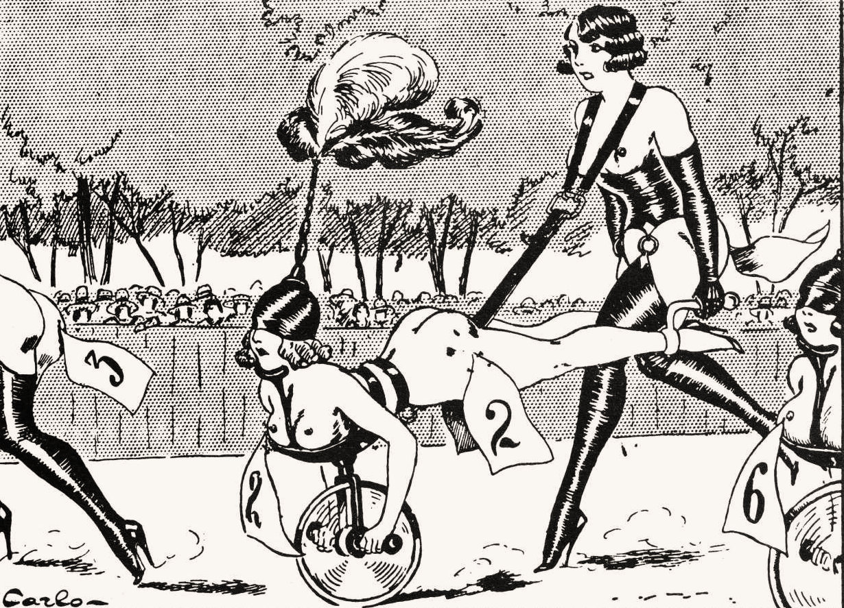 Between roughly 1930 and 1937, Carlo illustrated more than 25 albums and produced many individual plates for publishers including La Librairie Artistique, Édition Parisienne Réunies, and La Librairie Générale. This extraordinary output covers virtually every facet of early 20th-century BDSM and fetish fantasy: intense disciplinary scenes, female domination, corporal punishment (F/F, M/F, and F/M), pony play, bondage, suspension, whipping, corset training, branding, and elaborate power-exchange dynamics. His work appeared in now-classic titles such as: